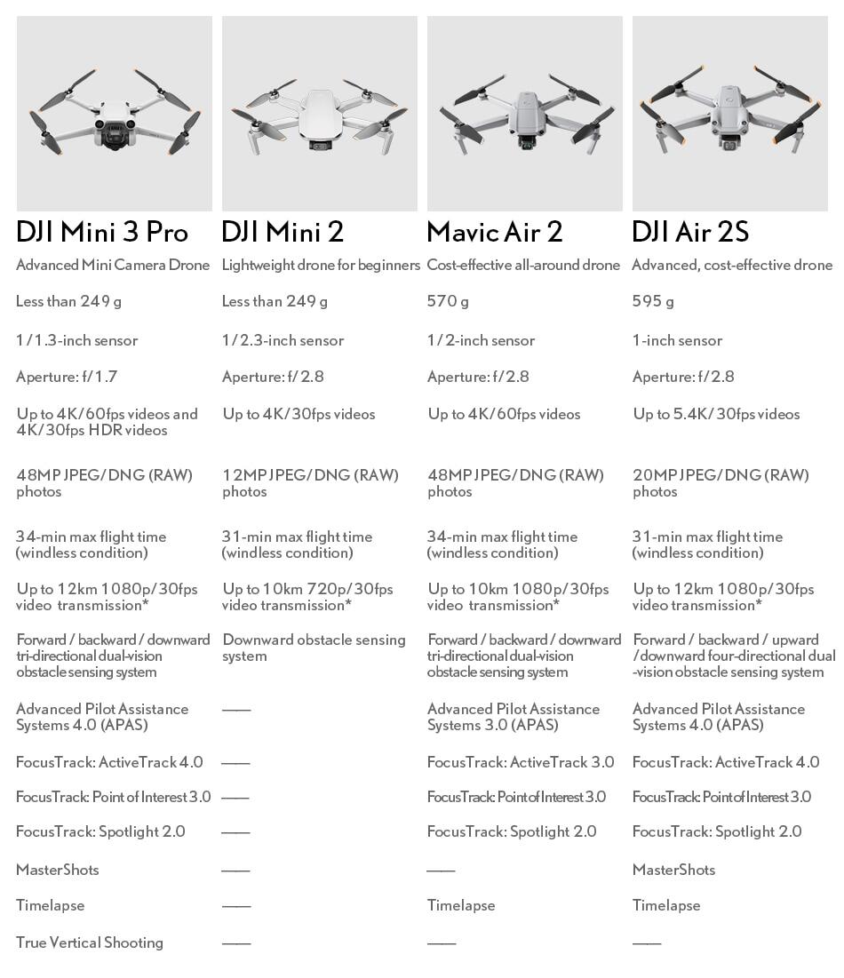 Compared with DJI Mini 2 and Mavic Air 2, DJI Mini 3 Pro has improved battery life, intelligent features, video transmission, and a fully upgraded imaging system and visual sensing system.