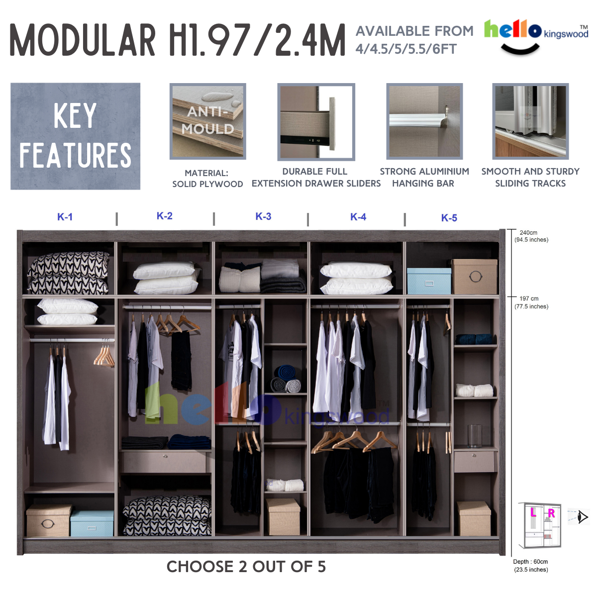 12 months manufacturer warranty Material: Solid Plywood Sturdy aluminium door frame Strong aluminium hanging bar Durable full extension drawer slides Width: 4.5, 5, 5.5, 6ft Height: 1.97m or 2.4m Depth: 60cm Models: Timo, Niko, Scanik, Megan, Joshua Available in 9 trendy colours